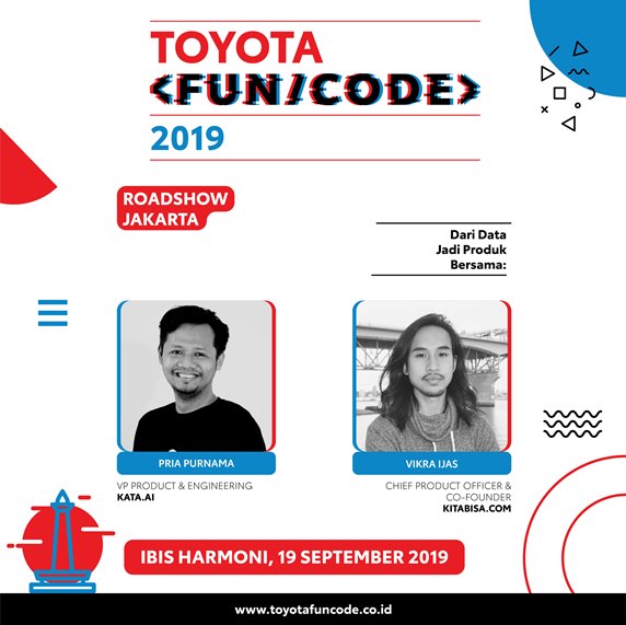 Roadshow Toyota Fun/Code di Jakarta yang digelar di Ibis Hotel Harmoni pada Kamis besok, 19 September 2019, akan menghadirkan Vice President Product and Engineering Kata.ai Pria Purnama dan Chief Product Officer Kitabisa.com Vikra Ijas.