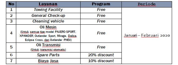 Adapun program tersebut terdiri dari penyediaan layanan gratis derek, general check-up, pembersihan kendaraan, Mitsubishi Motors Genuine Oil (MMGO), serta sejumlah diskon untuk parts serta biaya jasa selama periode Januari hingga akhir Februari 2020.